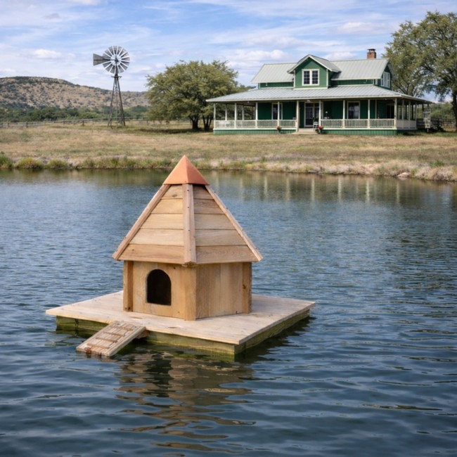 Top quality cypress construction makes the AquaDuck floating duck house the perfect home for your feathered friends. This beautifully constructed piece, featuring a 42″ square deck with buoyant styrofoam beneath it for a dramatic floating unit also features a wooden ladder at the front of the platform which offers nestlings a secure way to reach the house, while the floating body enables them to jump directly into water. The hexagonal shape of the shelter has a spacious interior, perfect for a mother water fowl and her ducklings. The tall roof adds height to the item, helping regulate the interior temperature, and the 9″ tall, arched openings allow the ducks to enter and exit with ease. A galvanized metal cap sits at the top of the lapped roof, bringing a rustic feel to the piece. Assembly required.