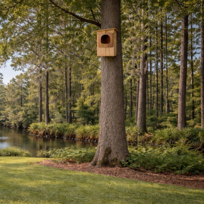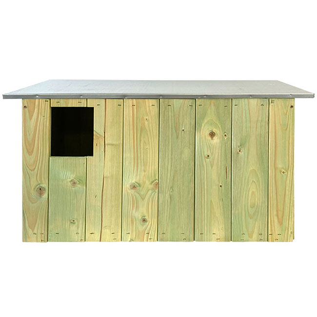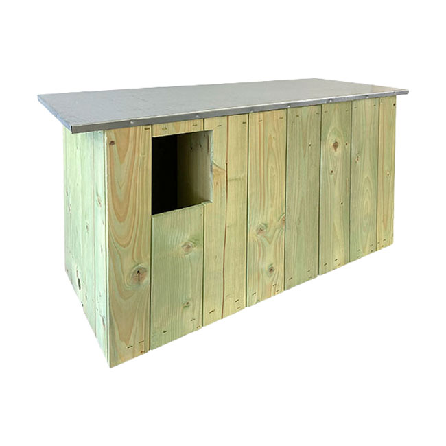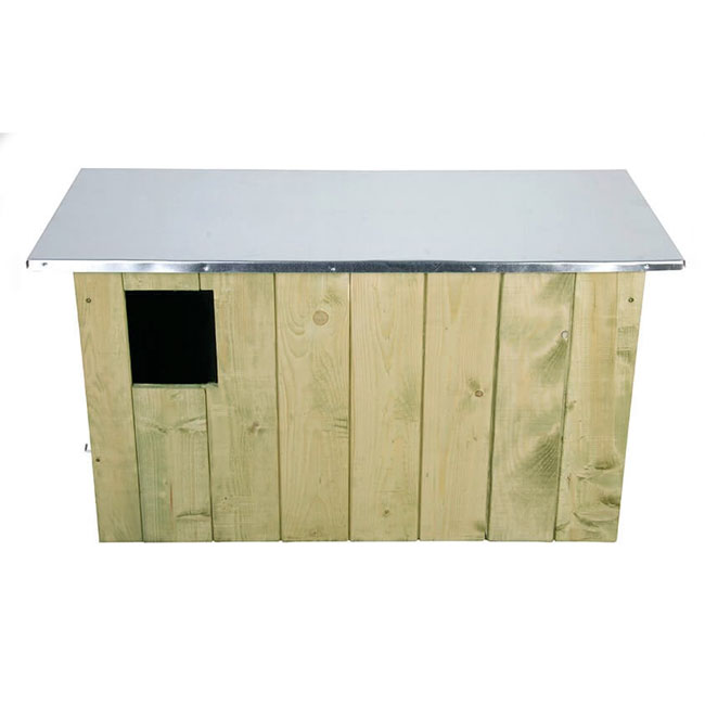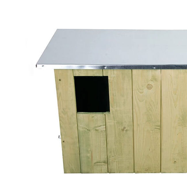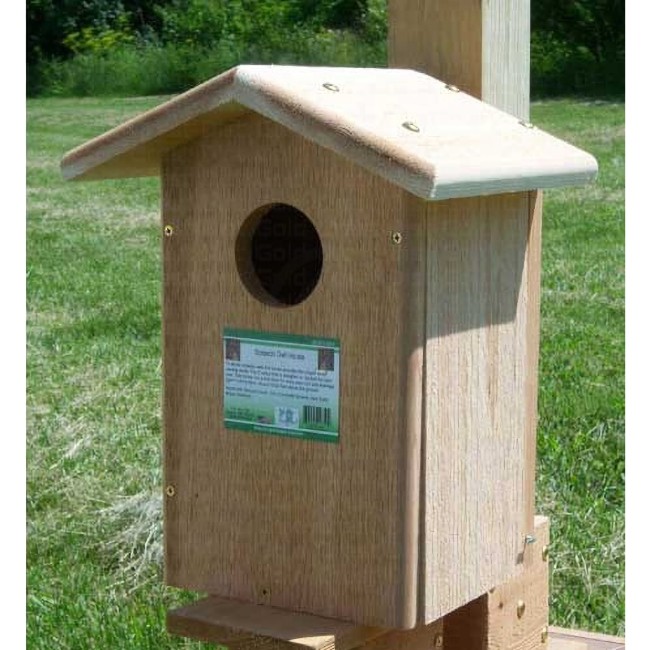 This generous, pine roost has a 4.75″ wide and 6″ tall, rectangular opening which entices the birds to enter, and a slight partition creating two chambers. This divider rests next to the opening, forming a small front apartment so the birds may act as a lookout or eat their prey. This section leads to the deep interior compartment, where the owls can build their nest and raise their young. A flat, metal roof completes the unit, and its silver color offsets the soft green of the home.