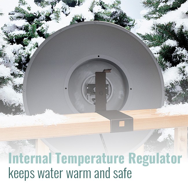 • An internal temperature regulator automatically turns the heater on and off, ensuring water remains at an optimal temperature that won’t harm birds or other animals.